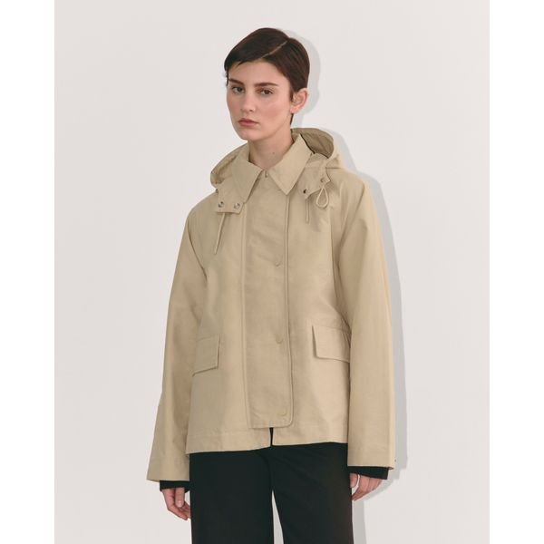 - Shell: Raincoat or trench with a hood or high collar.