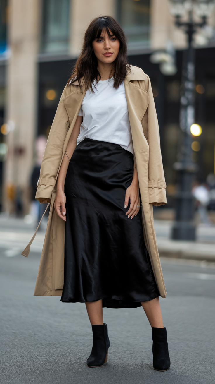 If you want to channel your inner fashion editor — this is the look. A neutral trench coat layered over your satin skirt adds instant sophistication. Throw on ankle boots and a silk scarf tied around your neck or bag, and suddenly you’re the definition of polished spring chic.