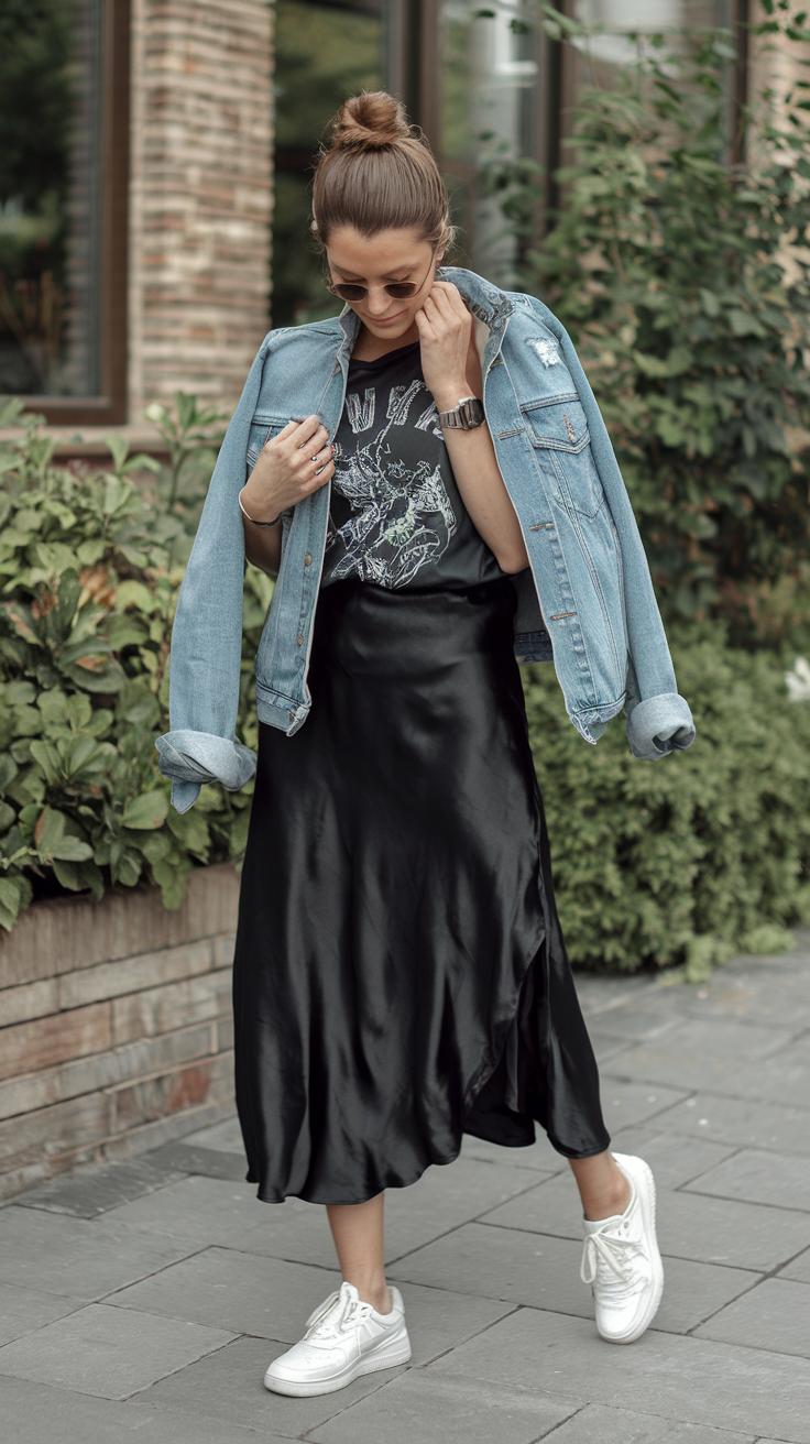 5. The Street Style Queen: Satin Skirt + Denim Jacket + Sneakers