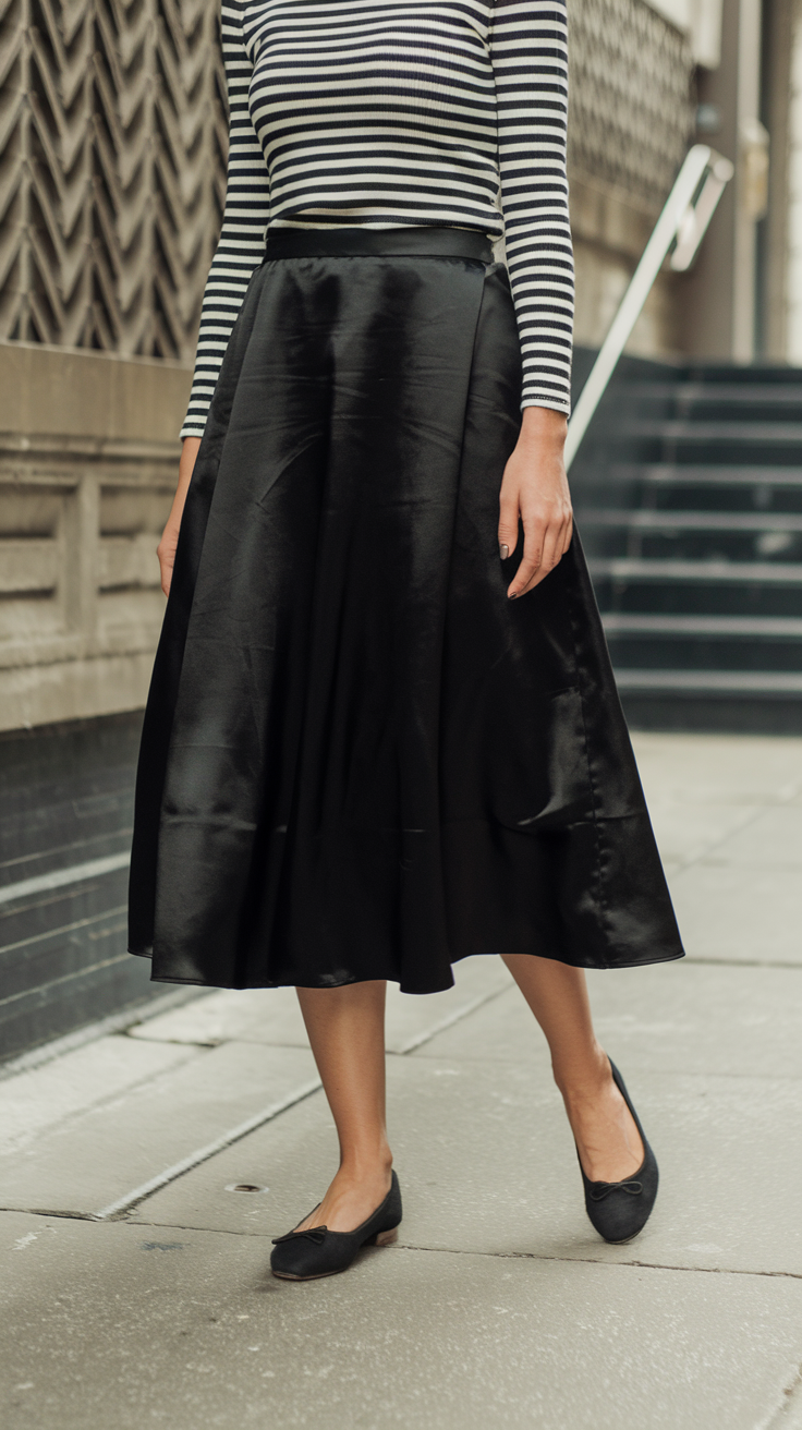 4. The Parisian-Inspired Look: Satin Skirt + Striped Top + Ballet Flats