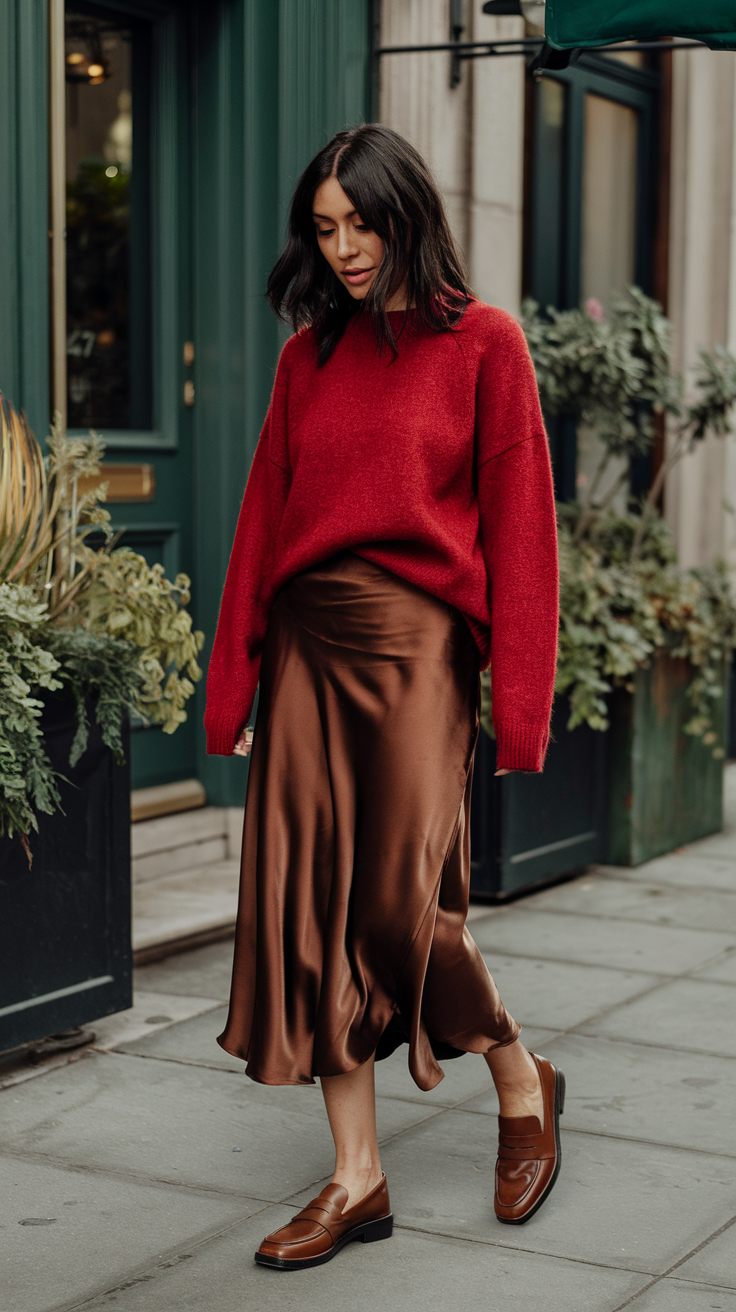 2. The Cozy Girl Spring Edit: Satin Skirt + Oversized Sweater + Loafers