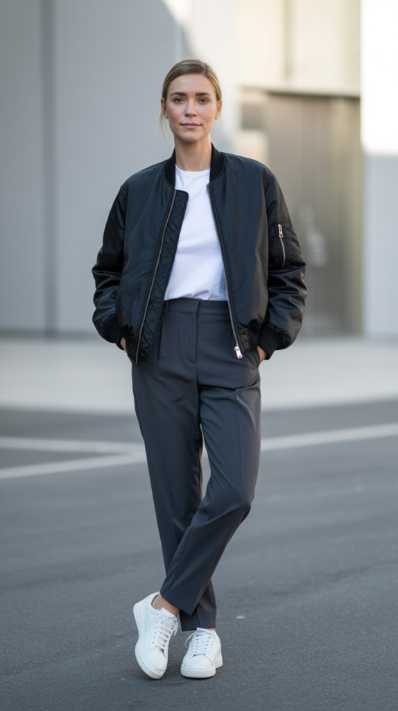 - Bomber + tank + pleated trousers + retro sneakers = chef’s kiss.