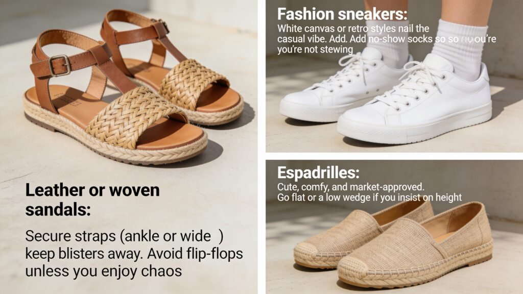 - Espadrilles: Cute, comfy, and market-approved. Go flat or a low wedge if you insist on height.