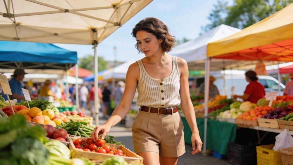 The perfect Sunday farmers market outfit nails comfort, movement, and a little flair. Start with breezy fabrics, add walkable shoes, and go hands-free with a crossbody plus a tote. Then sprinkle on a hat, sunnies, and simple jewelry, and you’re basically the poster child for peak weekend energy. Now go steal the look—and maybe a sample or three while you’re at it.
