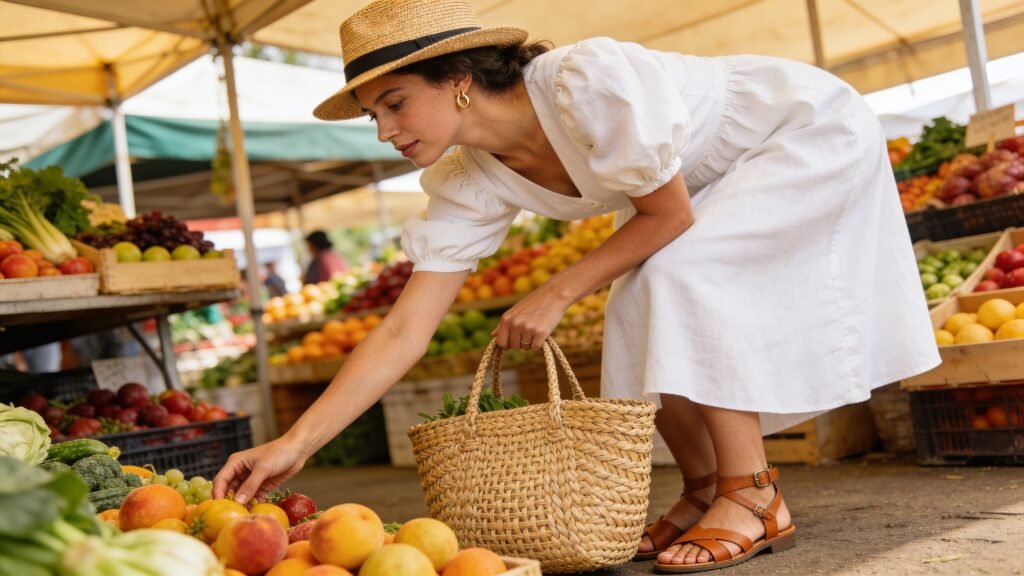 A flowy midi in cotton, linen, or a linen-blend keeps you cool and looks polished. Choose small prints or solid earth tones so your produce bag and hat can pop. Bonus points for smocked or wrap silhouettes—they flatter and flex after your second croissant.