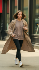 Taupe crewneck + black leggings + oversized trench + sneakers.