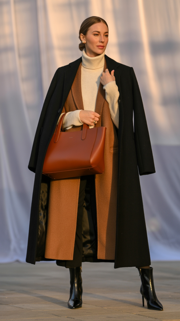 - Top Layer – Structured coat, trench, or blazer.