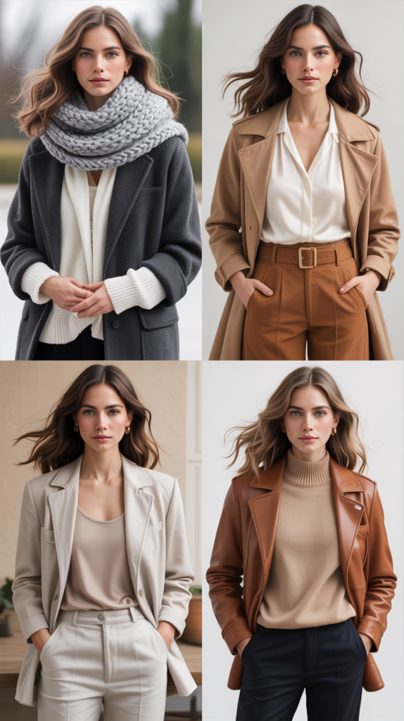 - Middle Layer – Textured piece (chunky knit, cardigan, or light jacket).
