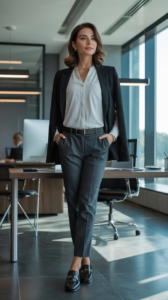 White silk blouse + grey wool trousers + black blazer + loafers.