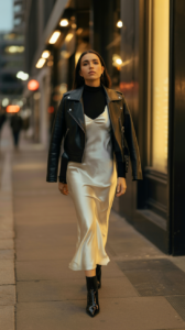 Charcoal turtleneck + satin slip dress + leather moto jacket + heeled boots.