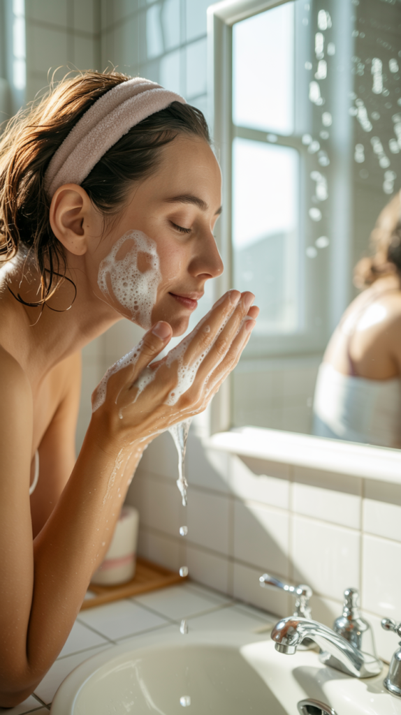 - AM quick cleanse: Splash with cool water + a pH-balanced gel cleanser. 20–30 seconds, tops.