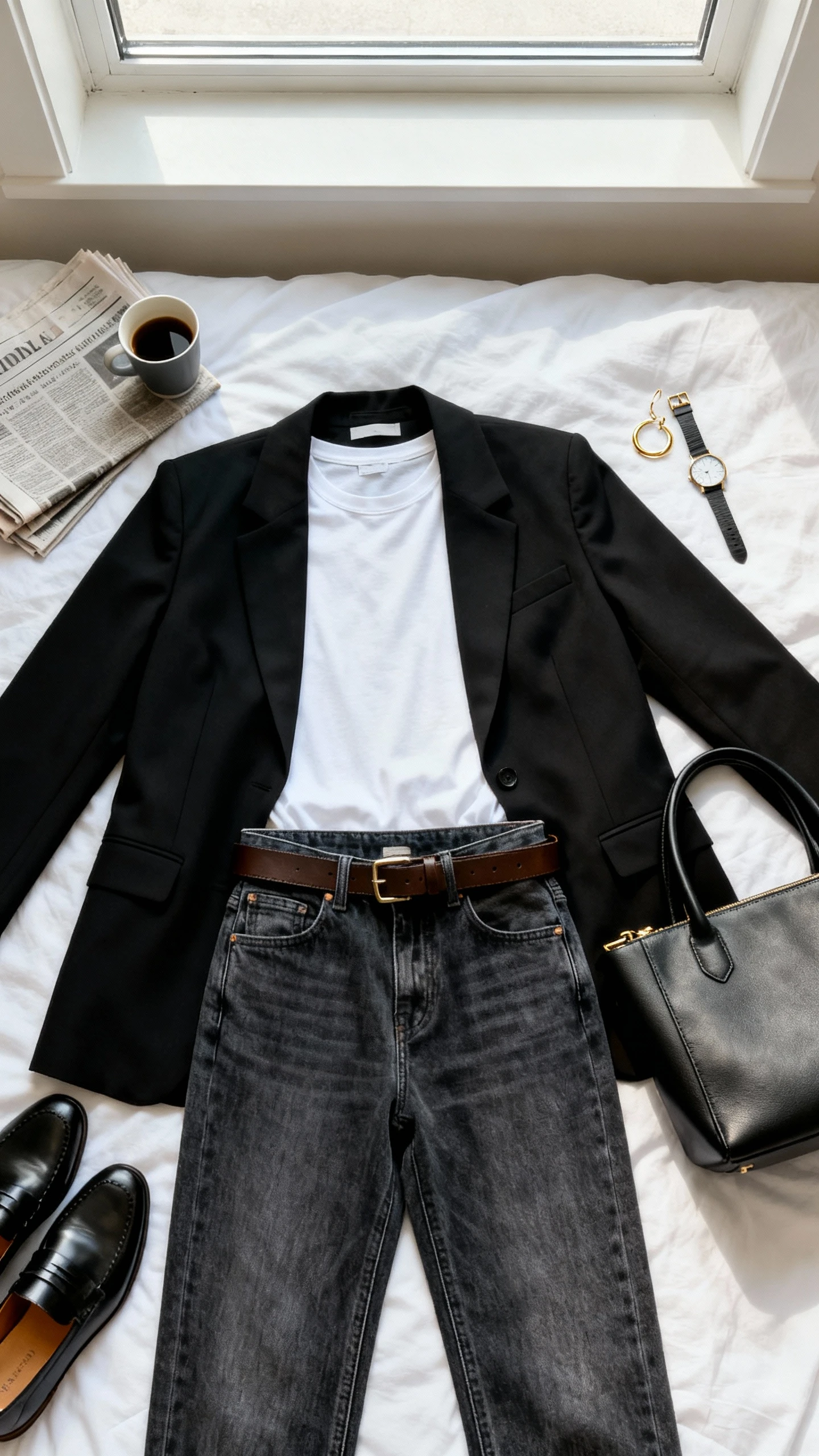 This combo is perfect for client meetings, gallery visits, or first dates where you want “effortless competence.” Swap the tee for a silk cami at night, or trade the loafers for sleek sneakers on busy days. You’ll repeat this one weekly, trust me.