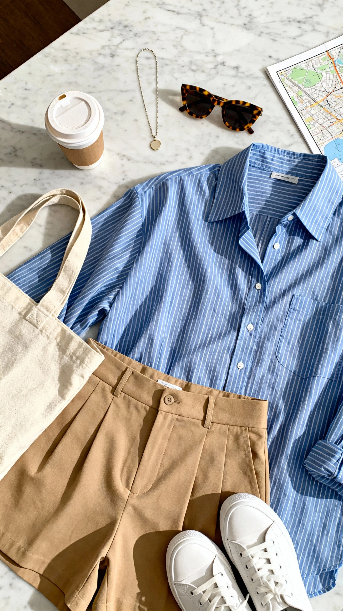 Perfect for farmer’s markets, rooftop hangs, or sightseeing. On chillier days, toss a lightweight sweater over your shoulders. If you prefer more coverage, swap shorts for ankle-length chinos and keep the rest the same.