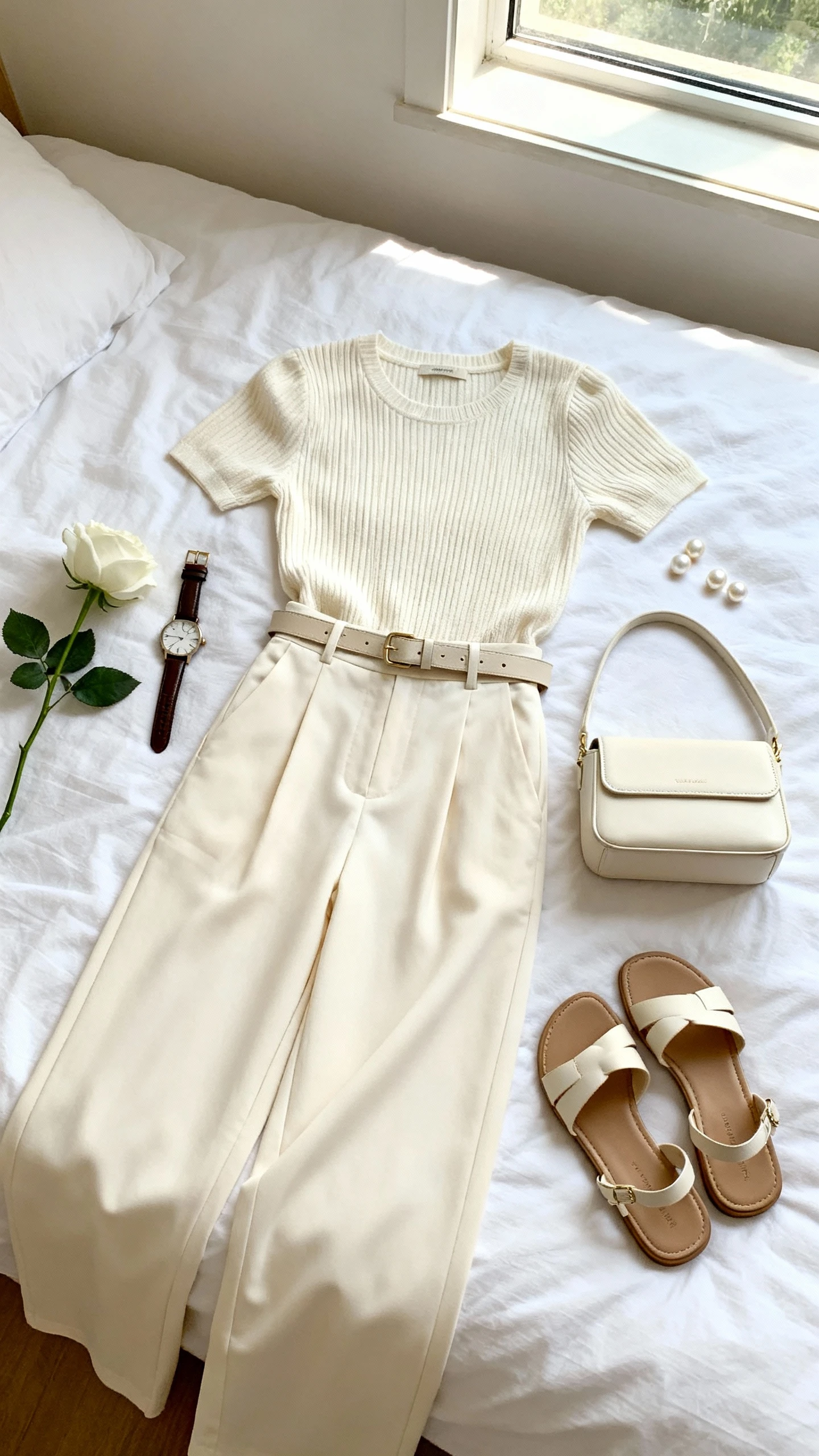 - Matching knit top and trousers or tee and tailored pants in black, cream, gray, or olive