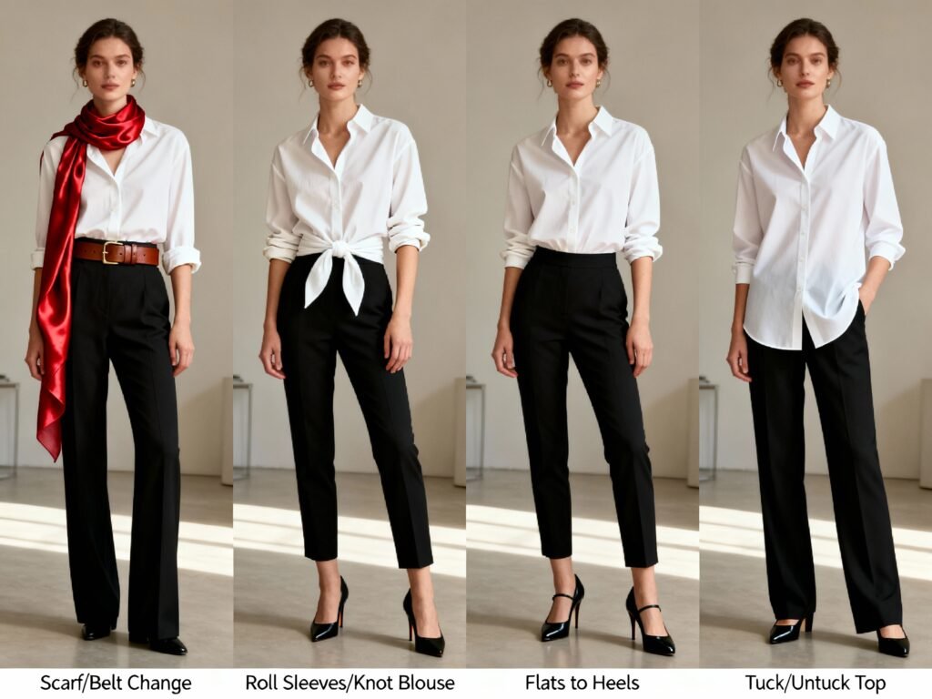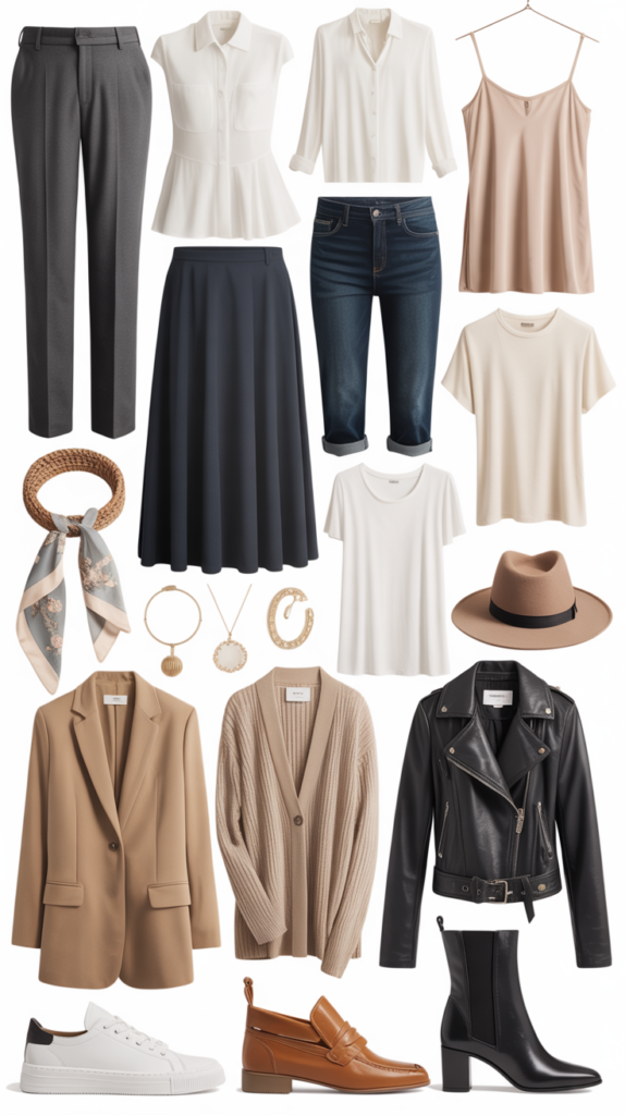 Pick two neutrals (black, tan, navy) and one accent (olive, blush, rust). This combo supports flexibility and adds polish.