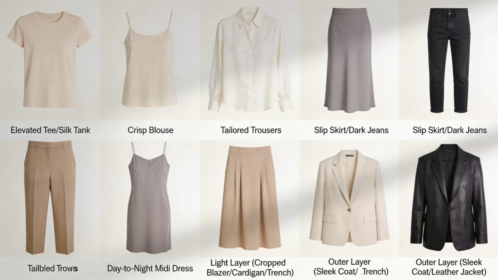 - 2 tops: One elevated tee or silk tank, one crisp blouse.