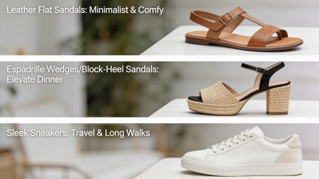 - Leather flat sandals: Minimalist and comfy. Avoid flip-flops with loud logos.