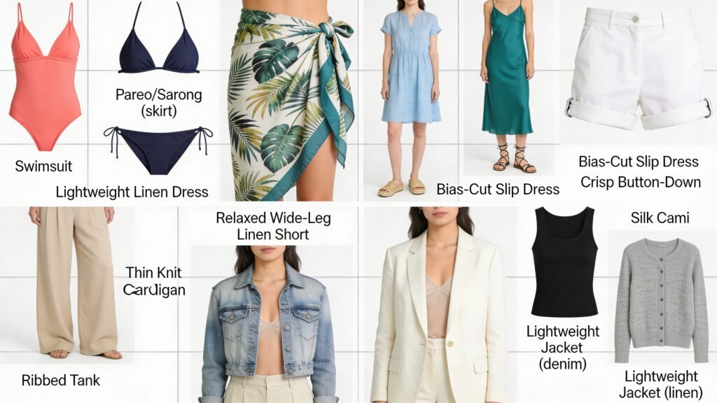 Color palette tip: Ivory, sand, navy, and black with one accent like coral or sea-glass green. Everything pairs. Nothing screams, “I panic-bought.”