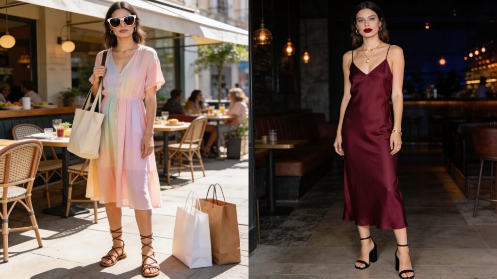 – Evening: slip dress, block-heel sandals, delicate jewelry, and a swipe of lipstick. Flawless with zero fuss.