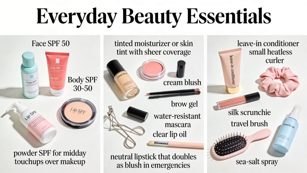 - Water-resistant mascara, clear lip oil, and a neutral lipstick that doubles as blush in emergencies.