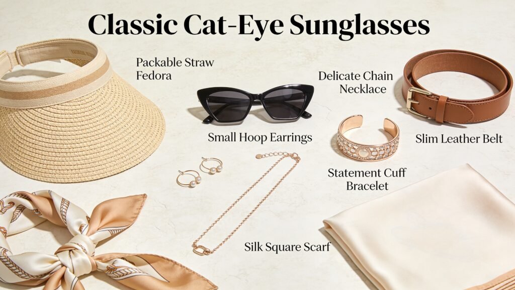 - Sunglasses: One classic pair (think cat-eye or square). Save the novelty shapes for TikTok.