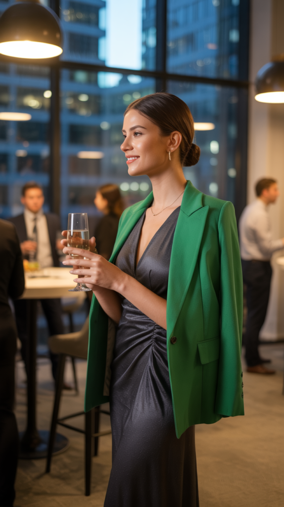 Lean into jewel tones (plum, sapphire, teal) or luxe neutrals (charcoal, espresso, ivory). Add shine through satin, metallic jewelry, or a patent bag. Festive doesn’t mean holiday mascot.