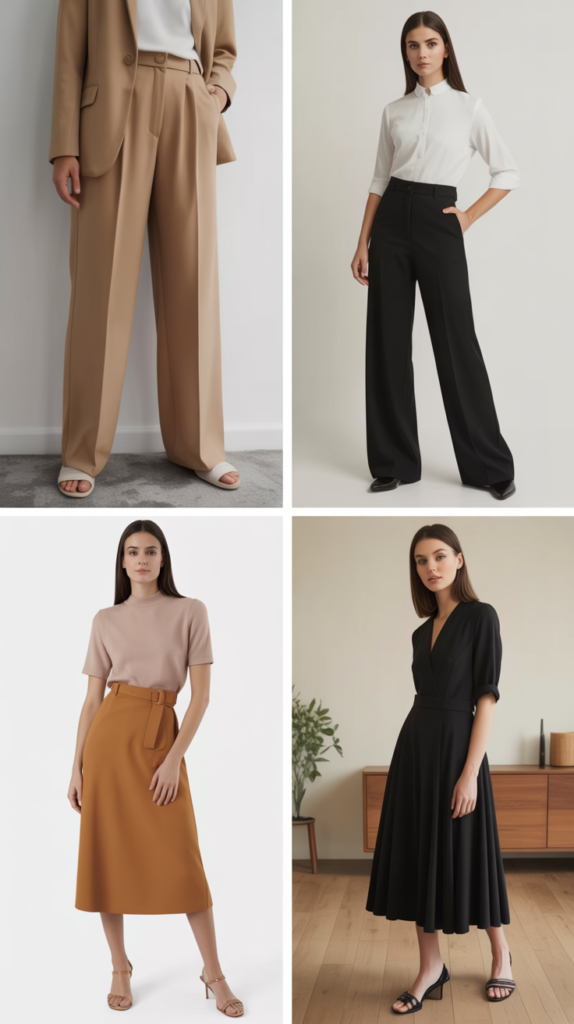- One classic anchor (tailored trousers, sleek midi, clean shirt)