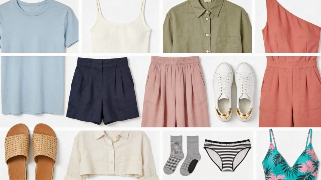 – 3 tops (lightweight tees or tanks; add one nicer shirt)