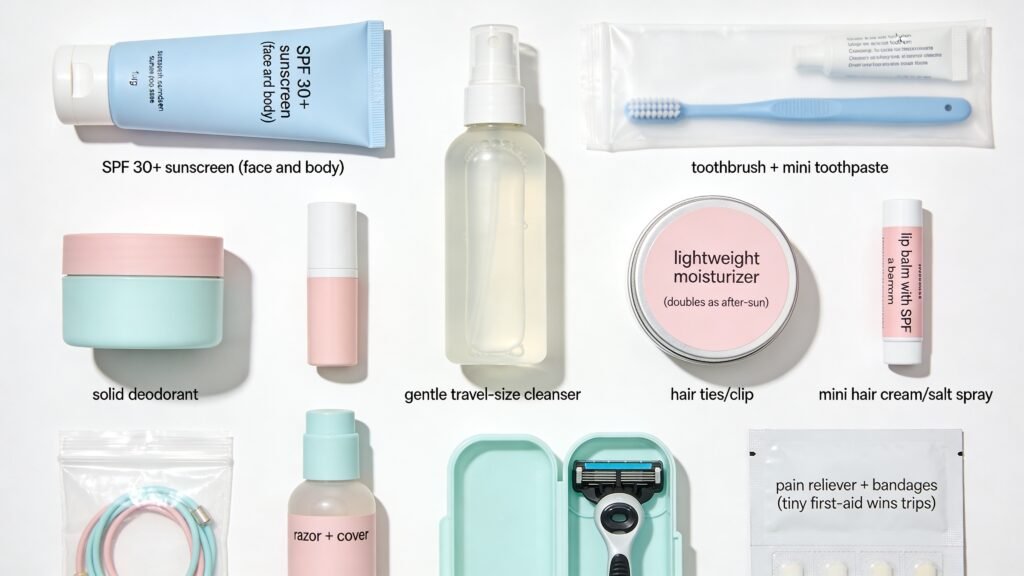 Optional but clutch: after-bite pen, hydrating mask for sun-zapped skin, and tiny fragrance so you smell like vacation and not like SPF and french fries.