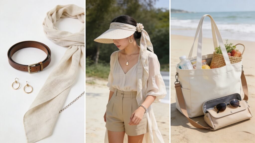 - Light scarf or bandana: sun shield, hair fixer, outfit elevator