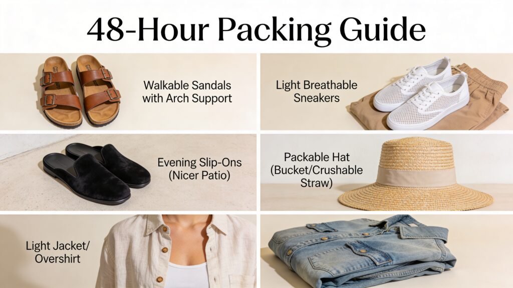 Bring one packable hat (bucket or crushable straw) and one light jacket or overshirt. A linen button-down over a tank? Yes. A denim jacket at night? Also yes. A parka? Calm down, we’re gone for 48 hours.