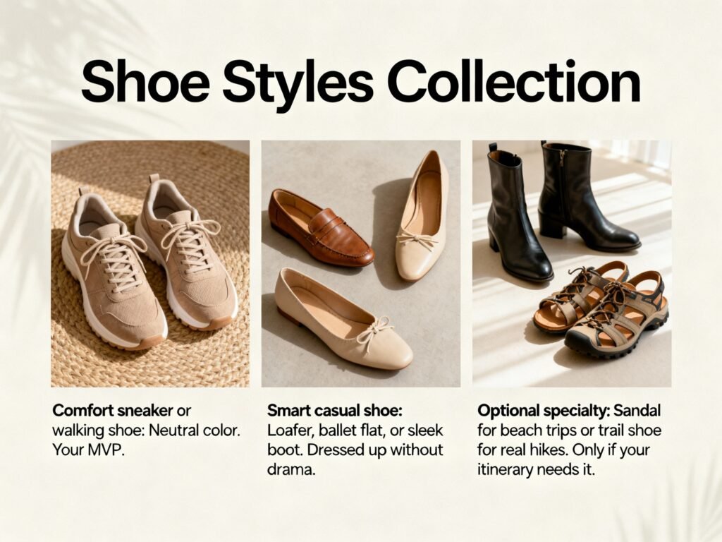 Shoes: walking sneaker + loafers/flats + optional sandal/boot.