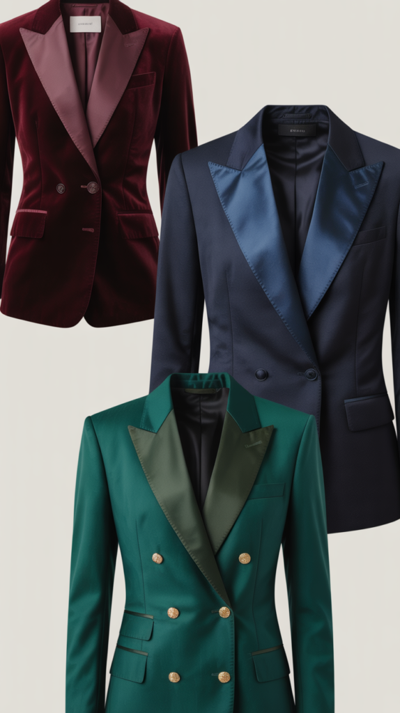 - velvet, satin lapels, or jewel-tone suiting.