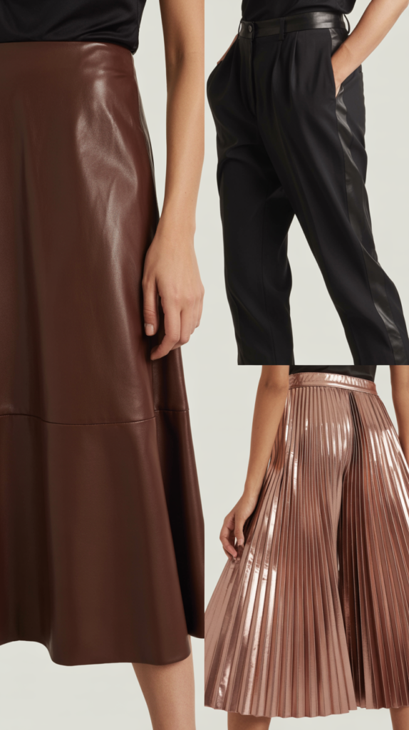 - leather midi, tailored tuxedo pants, metallic pleated skirt.