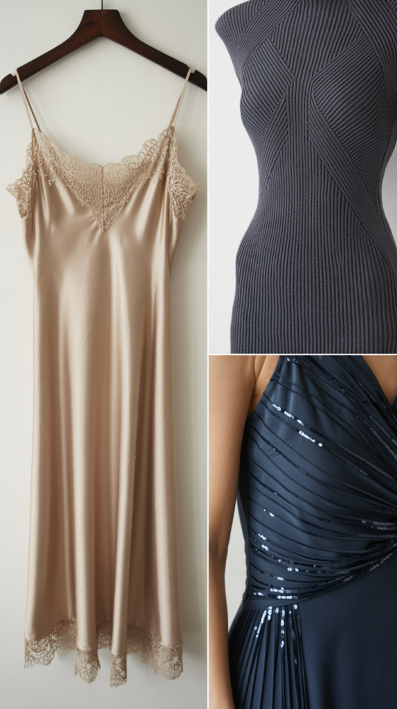- slip dress with lace trim, ribbed knit dress, subtle sparkle.