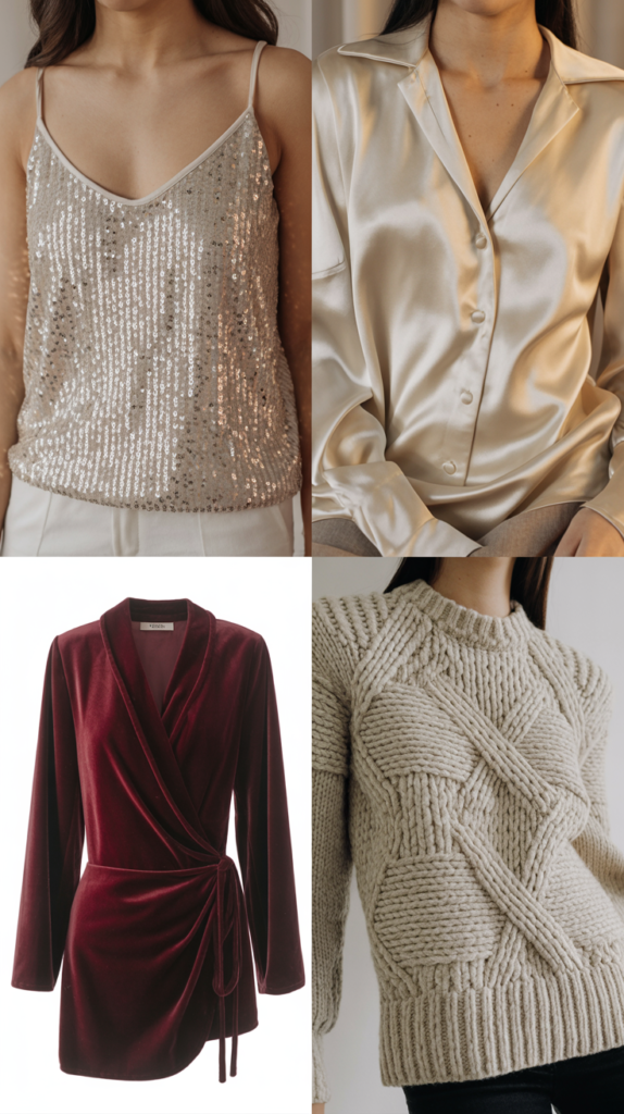 - sequined camisole, satin blouse, velvet wrap top, sculptural knit.