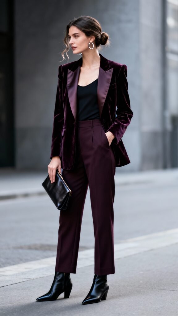 - Velvet blazer + black camisole + tailored trousers + pointed boots.