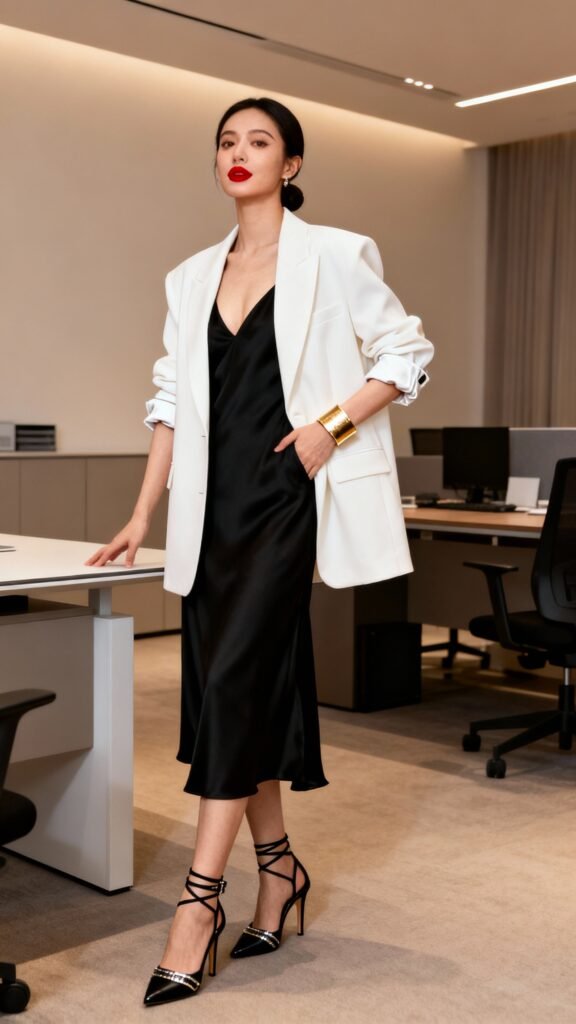 4. Slip dress + oversized blazer + strappy heels.