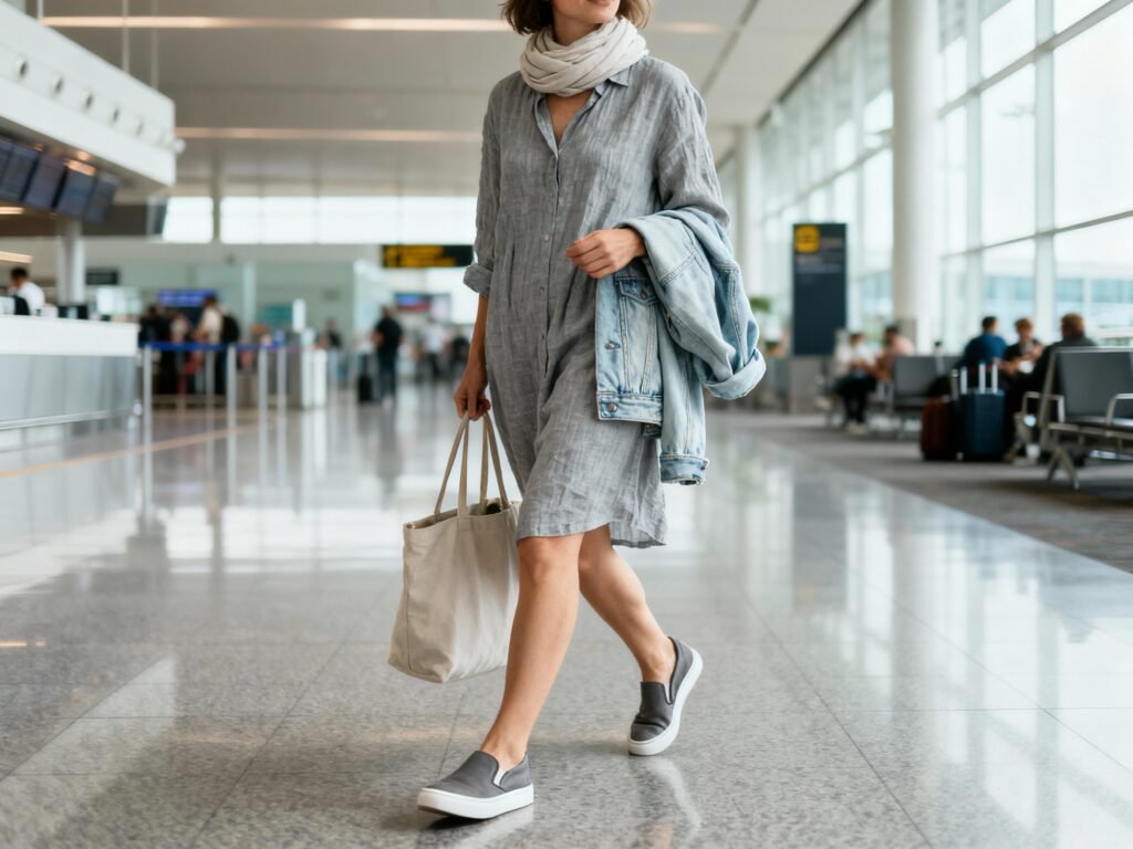 Airport outfit math: comfort + pockets + layers. The linen shirt dress works as a travel uniform and doubles as a beach cover-up at your destination.