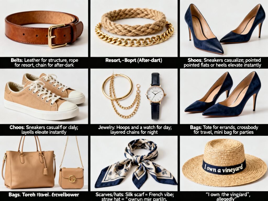 - Scarves/hats: Silk scarf = French vibe; straw hat = “I own a vineyard,” allegedly.