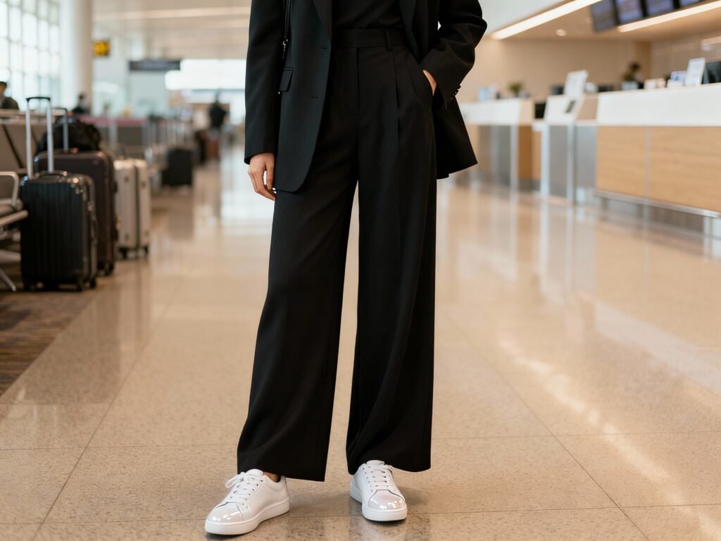 - Airport uniform: Polished sneaker + wide-leg trousers + lightweight blazer. You look first-class even in row 32.