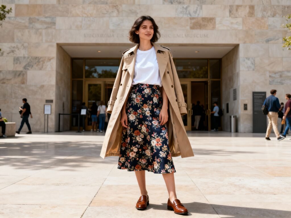 - Museum day: Loafers + midi skirt + tee + trench. Comfortable and chic in photos.