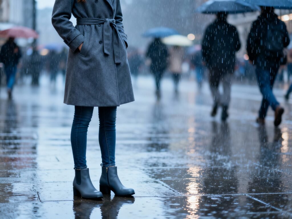 - Rainy-city capsule: Waterproof ankle boot with a slim shaft and low heel. Works with trousers and dresses.