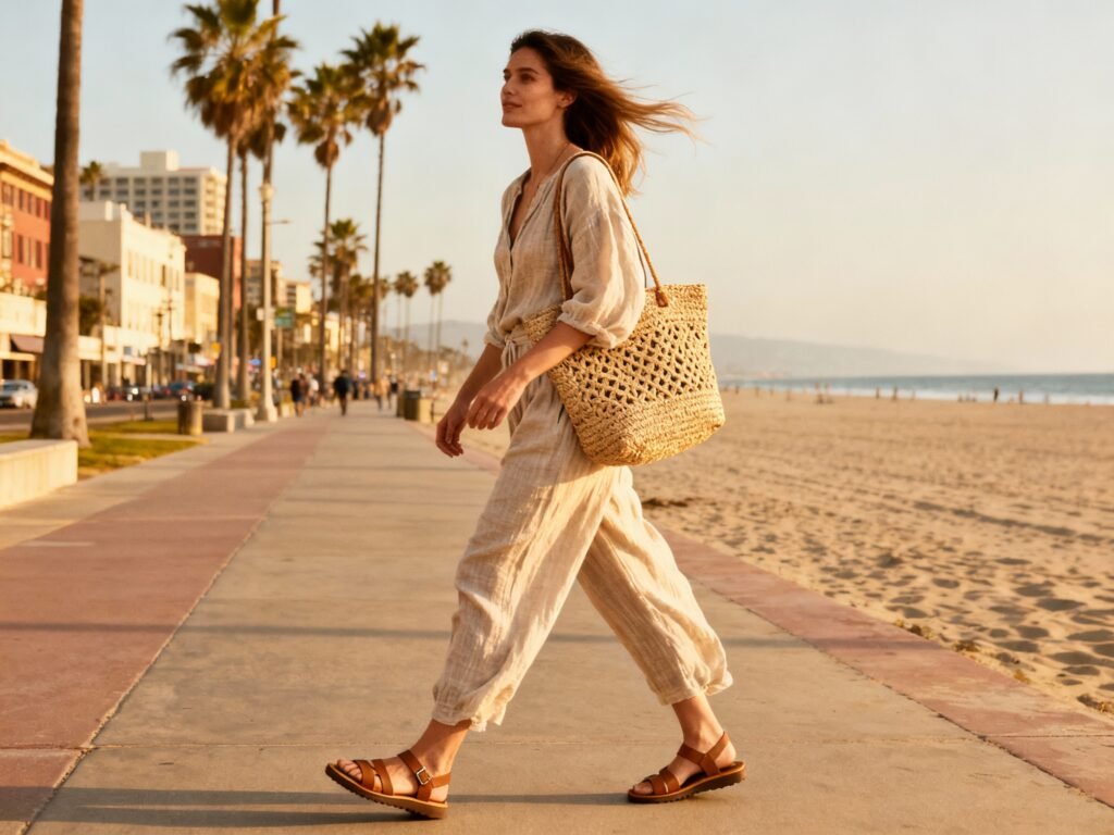 - Beach city stroll: Supportive sandal + linen set + raffia tote.