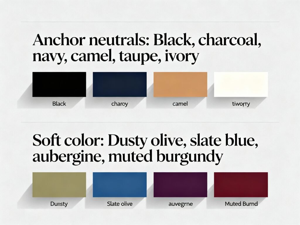 - Anchor neutrals: Black, charcoal, navy, camel, taupe, ivory. They always look rich.