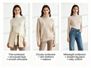 - Fine turtleneck + structured layer = smooth silhouette