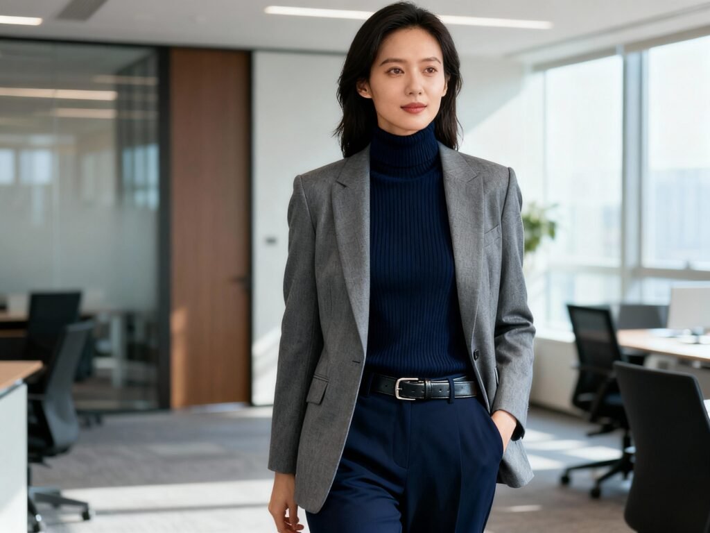 Office Minimalist: Navy fine-gauge turtleneck under a grey blazer + navy trousers + leather belt.