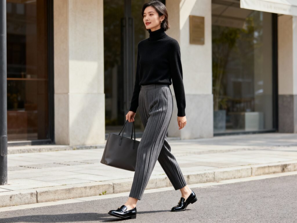 City Classic: Black merino turtleneck + charcoal pleated trousers + black loafers + structured tote.