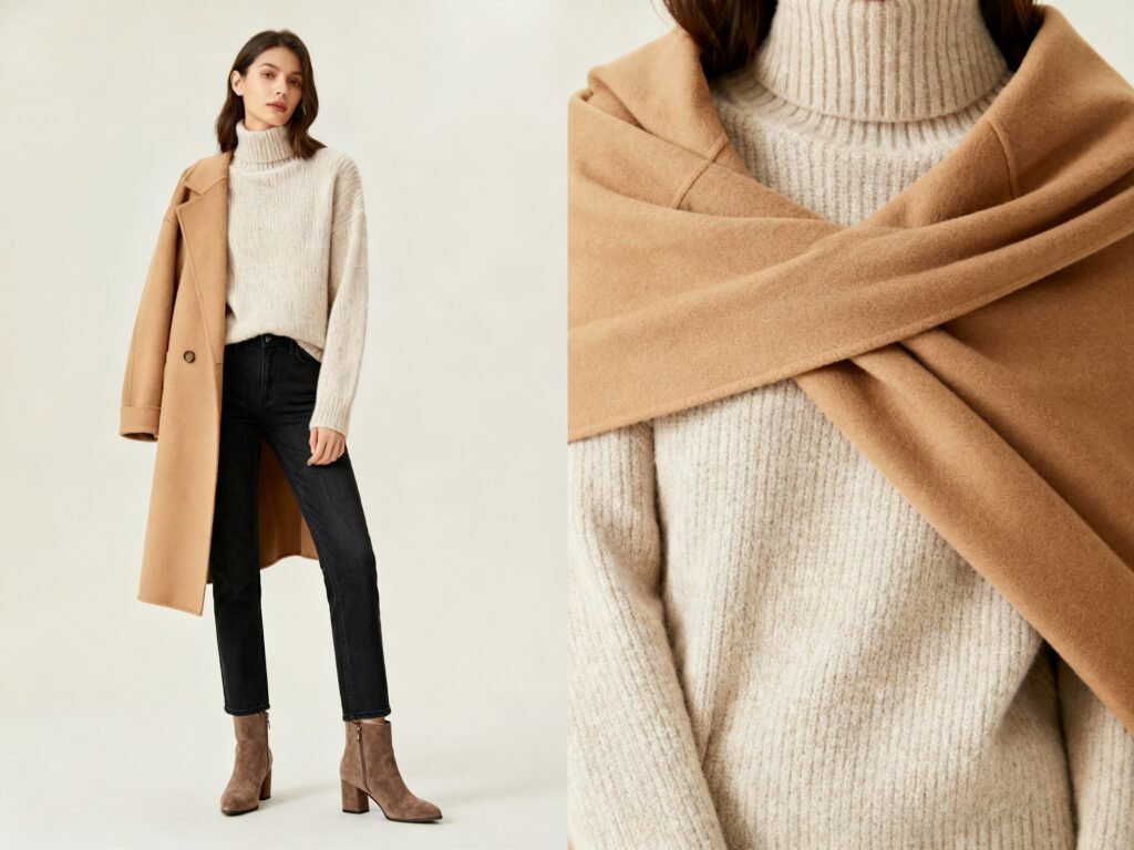 - Neck height: Mid-height or fold-over. If it strangles you, it reads awkward. If it puddles, it looks messy.