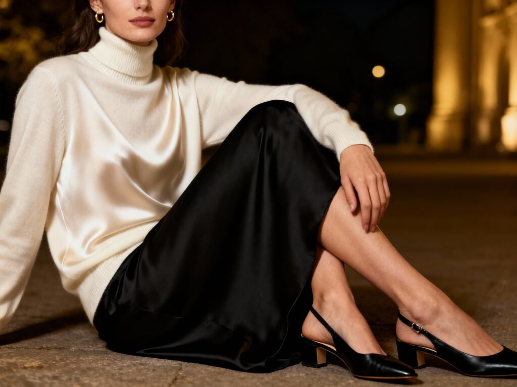 Evening Low-Key: Ivory silk-cashmere turtleneck + black midi slip skirt + slingbacks + tiny gold hoops.